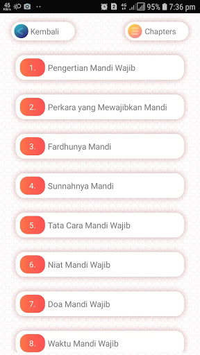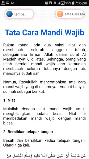 Aplikasi yang berisi cara mandi bersih ini akan memberikan Anda panduan lengkap bagaimana seharusnya melakukan mandi besar, baik itu disebabkan oleh haid, nifas, berhubungan atau sebab lainnya, sehingga Anda dapat bersuci dengan cara yang benar. Berikut adalah konten yang terdapat dalam aplikasi ini: