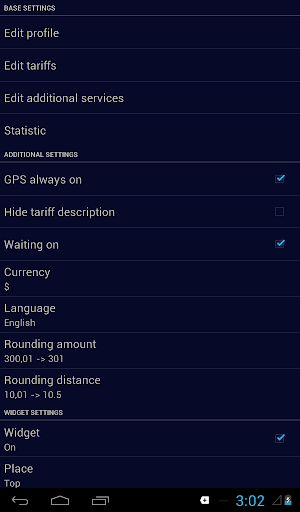 Adjust accuracy and rounding. You can set up rounding counting mileage, time and sum, and you can quickly remove a penny. With rounded you can even set for an hourly and hourly accounting - every incomplete kilometer or hour will be counted as complete. If the GPS reception is not accurate, you can turn on the GPS filter. Select a currency from several preset or set your own icon. The distances are measured in kilometers and miles.