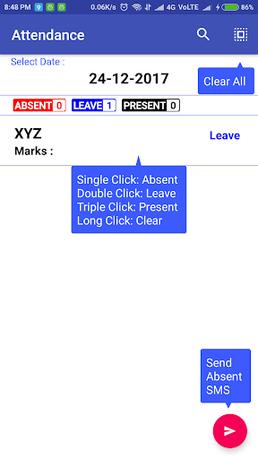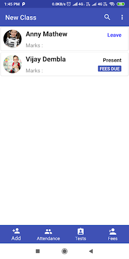 attendance app. It enables a private tutor or any coaching class or school to maintain a list of students enrolled, track their fees payment and attendance. The app allows Fees Receipts to be sent via SMS. This app stores all data locally on the mobile device and does not need any internet connectivity to function. A very easy to use Backup and Restore function (csv file) allows data to be saved from the app and transferred to another device thus ensuring continuity without any loss of data when you change your phone.
