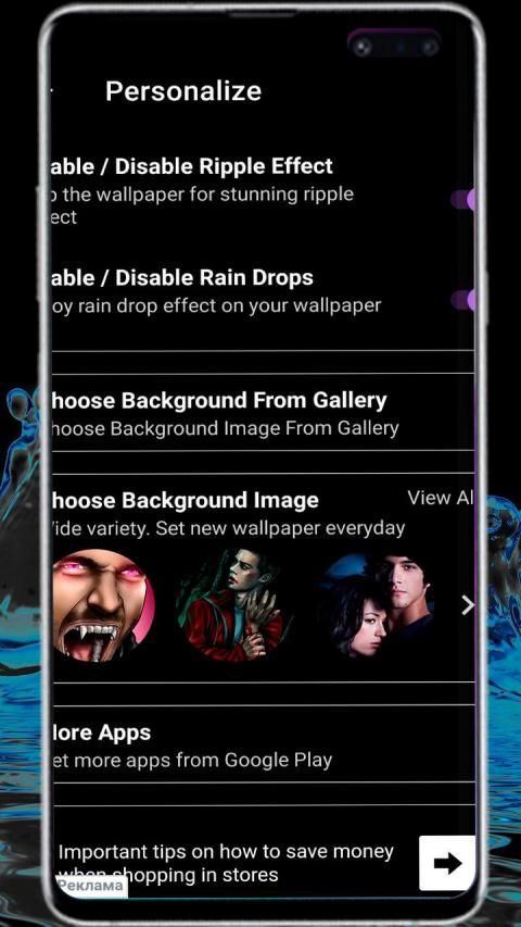 Your smartphone is definately a very dear device to you. If you want to make it look even more stylish and cool, then you definately will be interested in this app. We have prepared cute and creative wallpapers for your screen. They are not so simple. With a water ripple effect these wallpapers are almost alive and real which you can touch. In addition, this wonderful App offers you: