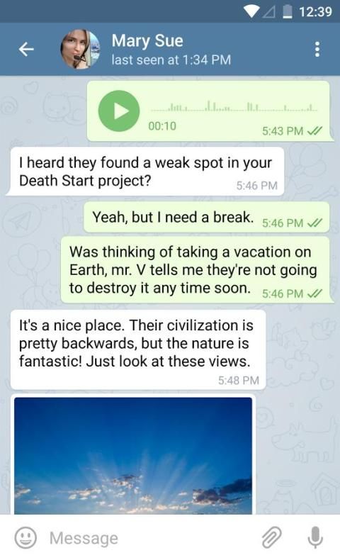 For those interested in maximum privacy, Telegram offers Secret Chats. Secret Chat messages can be programmed to self-destruct automatically from both participating devices. This way you can send all types of disappearing content — messages, photos, videos, and even files. Secret Chats use end-to-end encryption to ensure that a message can only be read by its intended recipient.