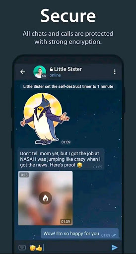 For those interested in maximum privacy, Telegramer offers Secret Chats. Secret Chat messages can be programmed to self-destruct automatically from both participating devices. This way you can send all types of disappearing content — messages, photos, videos, and even files. Secret Chats use end-to-end encryption to ensure that a message can only be read by its intended recipient.