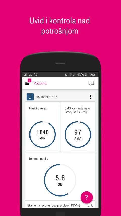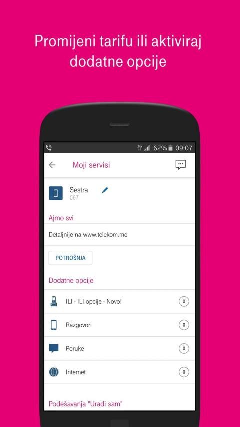 Registracija se obavlja automatski, a aplikacija odmah prepoznaje sve servise koje imate u Telekomu. Tada u aplikaciju dodajete i druge Telekom servise. Čim uđete na početnu stranu, prikazuju se informacije o potrošnji i preostalim minutima, SMS-ovima i intentet protoku. A onda se, kroz meni, otvara niz funkcionalnosti, gdje možete: