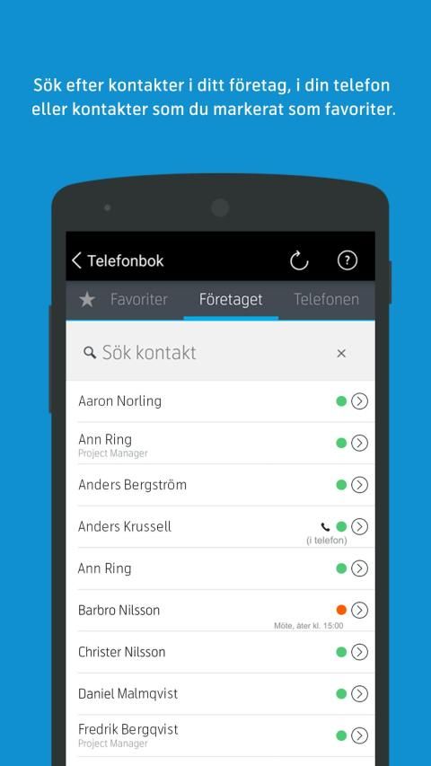 Genom Telenor One-appen får du som användare tillgång till ett flertal tjänster som blir smidigare och lättare att använda via appen. Du kan t ex söka på dina kollegor och se om de talar i telefon, är hänvisade eller tillgängliga. Du kan också enkelt hänvisa din telefon i appen och på så vis tala om för telefonisten, kollegor och partners att du är upptagen och när du åter är anträffbar.