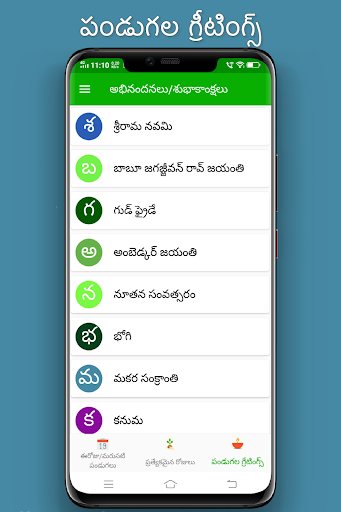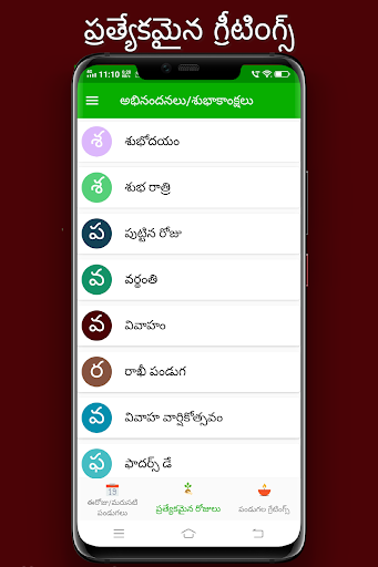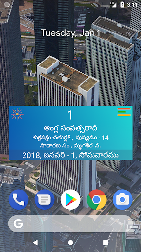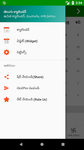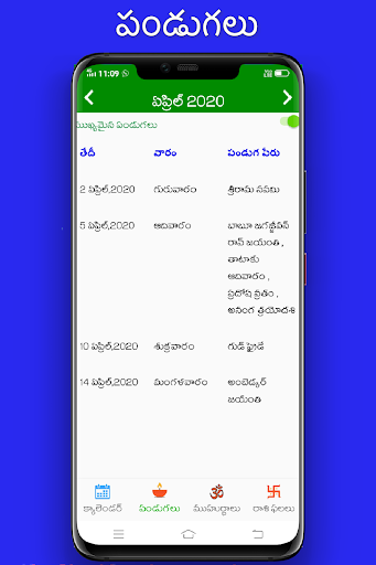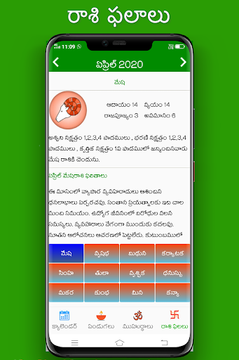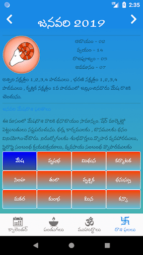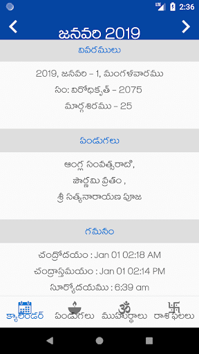 You can view information such as Tidhi, Nakshatram, Raashi, Karanam, Sun and Moon Rise and Set times, brahma muhurtam, raahu's Time etc., For easy view of data muhurtam, Festivals (Pandugalu), horoscope( Raashi Phalalu)