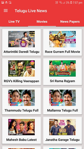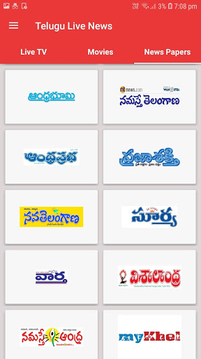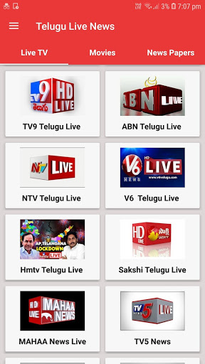 This app provides you live news 24X7 videos as well as Movies and News Papers . You can watch Telugu live news 24X7 on the go.
