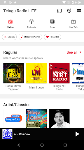 Our FREE Online Telugu FM Radio HD Live app has a collection of Regular (top live Telugu stations), News, Artist, Devotional and Classic online Telugu FM stations and podcasts. You can enjoy listening to your favorite Telugu Fm Radio and Telugu songs online with our user-friendly app without any interruption.