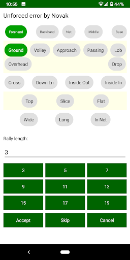 * Forehand/Backhand, Strokes (Groundstrokes, Volleys etc.), Misses (Wide, Long etc.)