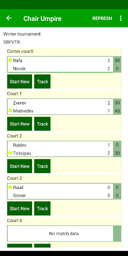 App now supports tournaments, (additional upgrade required) where tournament can have multiple courts, each of them can be tracked by chair umpire. Tournament live page in the web supported, with scores from all active matches.