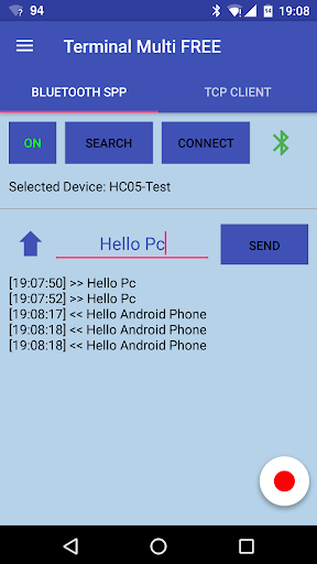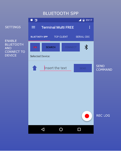 1) BLUETOOTH SPP: data are transmited/received between the phone and a bluetooth paired device via Serial Port Protocol (SPP)