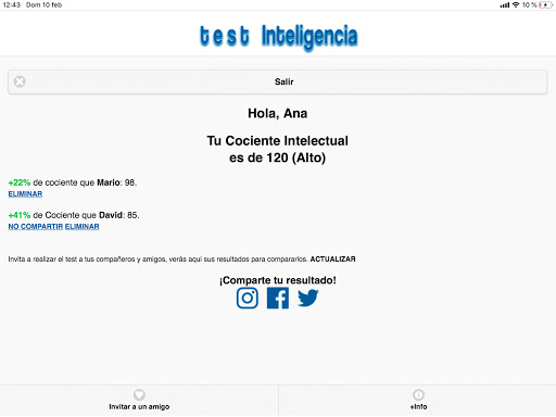 Además, tu cociente intelectual es bajo, medio o algo solo si lo comparas con otras personas ¡compara tus resultados con tus compañeros! Y compártelo en tus redes sociales. Es hora de que sepas quién es el más listo de tu grupo y el más... ¿rubio?👱🏻♂️