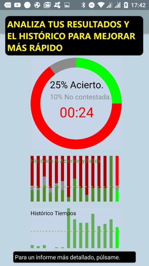 Knowing exactly how well we answer the questions is also very important, so we show you at the end of each test the degree of right and wrong questions, the time it took to take the test as well as a detailed report with the correct questions and answers that You should have responded as well as the ones you failed.