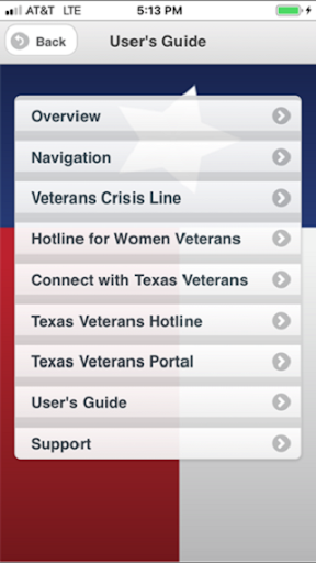 The Texas Veterans App is a mobile application designed to provide U.S. Military Veterans easy access to the Veterans Crisis Line, Hotline for Women Veterans, Connect with Texas Veterans, Texas Veterans Hotline, and the Texas Veterans Portal. The Veterans Crisis Line and Hotline for Women Veterans are nationally supported help lines. The Connect with Texas Veterans option provides a number for users to call and request help with connecting to other veterans within their geographical area of Texas. The Texas Veterans Hotline provides information on veteran’s benefits. The Texas Veterans Portal option allows a user to easily access additional online resources located on the http://veterans.portal.texas.gov/en/Pages/default.aspx web page.