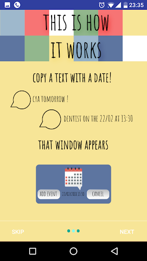 All you have to do is copy a text, and T2E will suggest you to create an event in the calendar while filling the correct parameters (text, date, time, mail, etc...) in the correct fields !