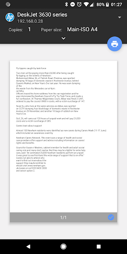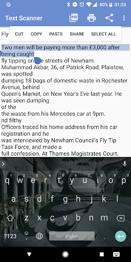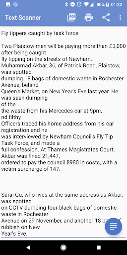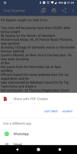 The text will show in the app where you can view it, edit it, share it with any other app, save it as a file or send it to a printer or create a PDF with it using PDF Creator.