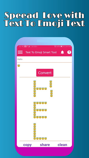 Normal Text to Emoji Text: Simply Type Normal Text & Choose Your Emoji Then Your Text Convert Into Emoji Text. Means if type A & Click on convert A make with Lots of emoji.