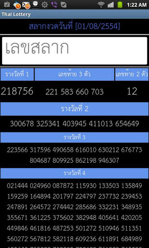 gt;v2.2 App2SD samsung Galaxy Tab Android 2 3 Samsung Galaxy Tab 17:00 3 veera July 2, 2011: : Damrongchai June 17, 2011: : June 17, 2011: : 5 2 The program for checking Thai Lottery39;s results.Features CheckShow lottery result of specified date show possible prizes while entering number gt;v2.2 App2SD Scrub the screen to find numbers Take picture to use as background on finding numbers screen. For Galaxy Tab, it need to be upgraded to Android 2.3 to use this feature Set language in the application Support Large Screen e.g. Samsung Galaxy Tab. On the published results day, results can be checked after 17:00pmUsage Click at date to change round At random number screen, click menu to use cameraKnown issue: retrieving lotto result is very slow on lotto result announcement date Set load data timeout to be 3 sec. Then an error will be popped up to prevent too long loading. Workaround: Add retry after timeout when load lotto results.
