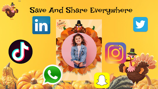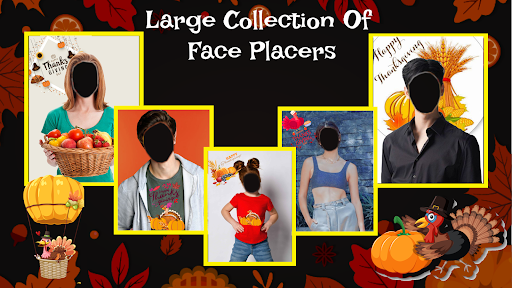 Happy Thanksgiving Wishes Image Editor 2023 is the huge collection of editable card templates. You can personalize these Turkey day cards by adding thanksgiving messages, thanksgiving quotes & thanksgiving wallpaper. Moreover, you can enhance the beauty of your Thanksgiving E-cards by adding picture frames and thanksgiving stickers. You can also import images and add memorable pictures of family and friends from the gallery or click a fresh pic from the camera and add 1 turkey day frames on it. In the face placer feature, you can place your face on one of the thanksgiving styled suits using advanced photo editing tools. Last but not least you can edit your profile picture, DP and thumbnails for popular social media platforms such as Facebook, Twitter, Instagram and Whatsapp with a Thanksgiving theme.
