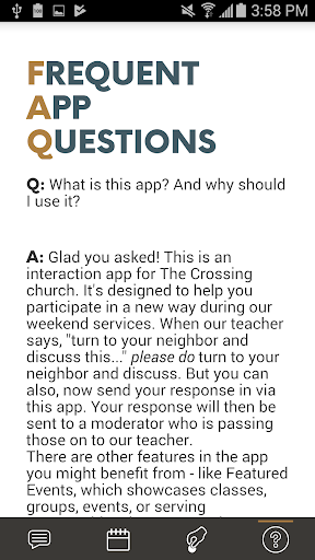 We understand this isn’t your traditional church app. It is, however, a unique, new tool to help you engage in our services. So, we hope you’ll download it and join the conversation.