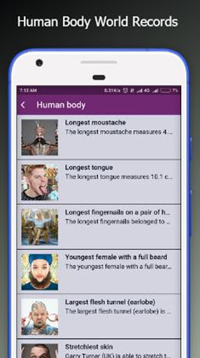 This application contains some of the famous Guinness Worlds records by several famous people, communities and countries of the Worlds. The Guinness Book of World Records are thousands of amazing new records, cool facts and awesome pictures.