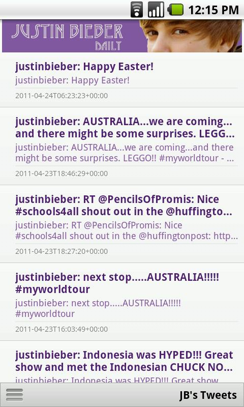 Are you a Belieber? Then this is the app for you! Get all the latest news, tweets, videos, interviews, amazon products, and more!The best part about this app is that it's updated by the second, real time! So it's ALWAYS current! You'll see 100's of new posts daily, all about JDB!Here's the content in the Justin Bieber Daily App:* Justin's Tweets shown real time as he tweets them!* The latest news on Justin from around the world! updated by the second, as articles are posted, you see them on your app!* Justin's Youtube Channel updated as he posts new videos.* Video Interviews with Justin.* Bieber Facts from twitter feeds, updated all the time* Bieber Quotes, always new and updated by the minute* Love the Bieber #Imagines? We have that too! Real time Twitter posts for #Imagine tweets!* the Twitter feed of @the_dailybiebs which includes Justin Bieber Facts, Trivia & Quotes.* Swayables all related to Justin* Justin's website * Bieberzone website news and updates.* Justin's Website's rss feed * The latest Justin Bieber products the minute they are added to the Amazon.com store!Harpcorp, Inc's Justin Bieber Daily App is custom RSS reader specific to Justin Bieber content. All copyrights and Trademarks are owned by the respective owners. The Justin Bieber Daily App is not endorsed by or affiliated with Justin Bieber.Recent changes:Added better pictures! that are also updated real time.Content rating: Everyone