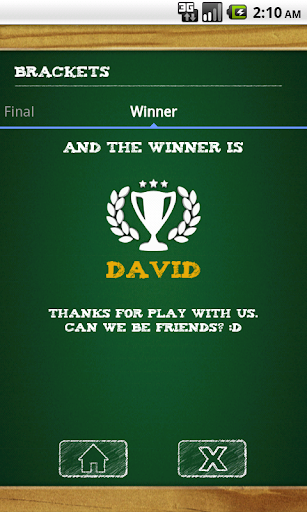 Tired of write down your matches with friends on pizza box? The Tournaments Manager can manage any kind of tournament: King of the hill, League and Brackets. Save your historical results and statistics of your games. Post on facebook the tournament winner. Up to 32 players per tournament. Ideal for tournaments FIFA and PES. Enjoy it! It's free! The best Tournament Maker and Bracket Builder.
