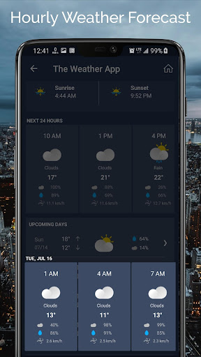 You need to allow the location permission after that The Weather App automatically detect your current location. There are many information in the app which includes weather, temperature, condition, wind speed, humidity, sunrise, sunset and also have hourly forecast.