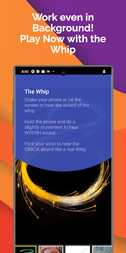 Shake your phone or hit the screen to hear the sound of the whip.