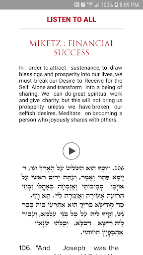 The Zohar app gives access to key sections of the Zohar that can help the reader in various areas of life such as health, sustenance, soulmates, etc. This app has both the original Aramaic text and English translation by Michael Berg. In addition, you can hear audio recording of each verse and create playlists of Zohar passages that are significant to you.