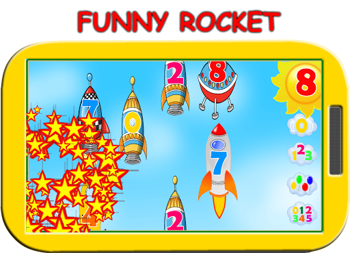 The screen is a sky where the rockets are launched with the numbers on them. A task is given - to find a number that is pronounced and written in the sun. The numbers with the rockets fly constantly upwards and the kids needs to have time to find the required number on the rocket and press the rocket.