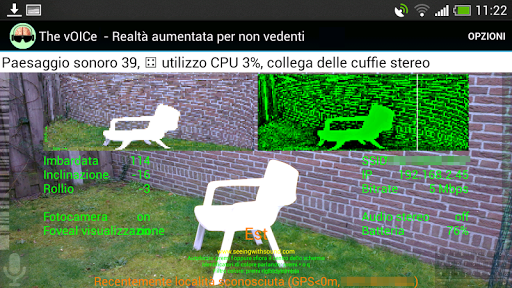 See with your ears! The vOICe for Android maps live camera views to soundscapes, offering augmented reality and unprecedented visual detail for the totally blind through sensory substitution and computer vision. Also includes live talking OCR, a talking color identifier, talking compass, talking face detector and a talking GPS locator, while Eye-D and Google Lookout object recognition can be launched from The vOICe for Android by tapping the left or right screen edge.