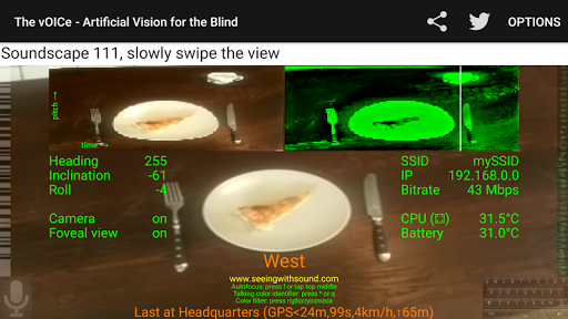 Do not worry about the many options of The vOICe for Android: human eyes have no buttons or options, and The vOICe is similarly designed to perform its main function out-of-the-box, so you do not have to use any options to get going. Some of the most common options appear as you slowly slide your finger across the main screen.