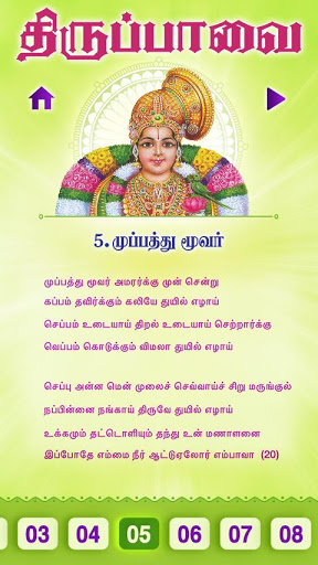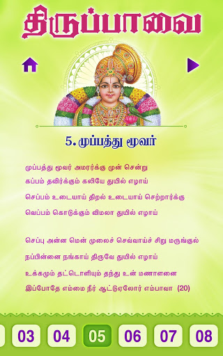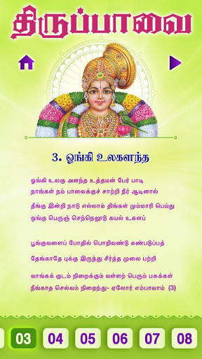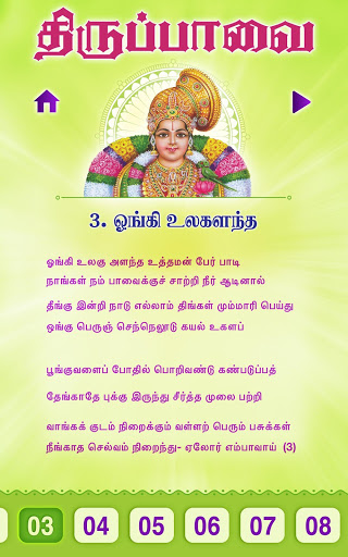 for the same. Anybody can learn it so easily. You just get the feeling of a traditional Thiruppavai book ion the mobile form. More better, as you get the audio for all the 30 songs played in the background. As you hit the “Number buttons” for the audio. How more exiting can it get. Go ahead and enjoy the Margazhi month by listening to all the 30 songs everyday.