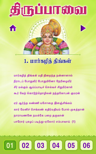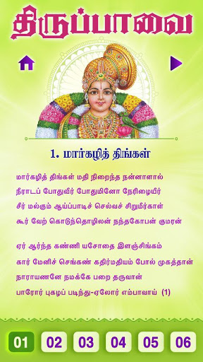 Our Thiruppavai app comes both with the complete lyrics of the song (In Tamizh) and the audio