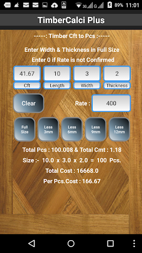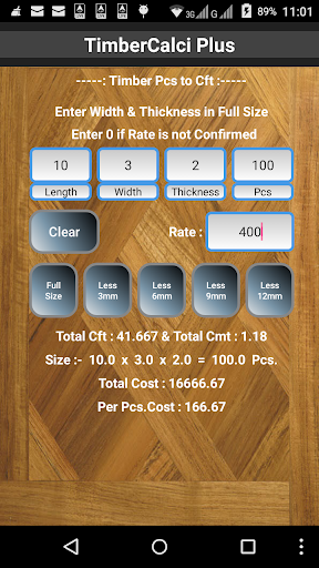 > Just enter full size of Timber and press the desired button for calculation. (i.e. Full size, Less 3mm, Less 6mm, Less 9mm, Less 12mm)