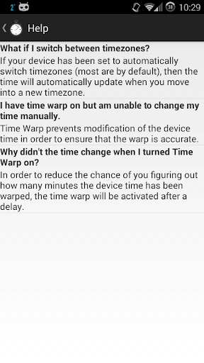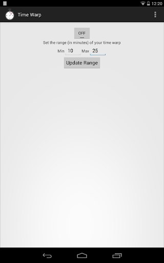 NOTE: You must turn Time Warp off before you uninstall it in order to correct the device time. If you accidentally uninstall it before turning it off, just reinstall the app and turn it on and then off again.