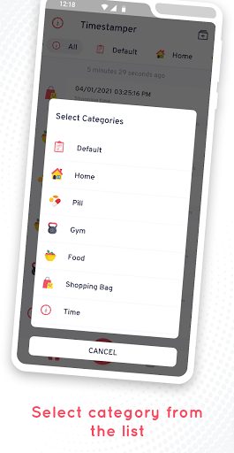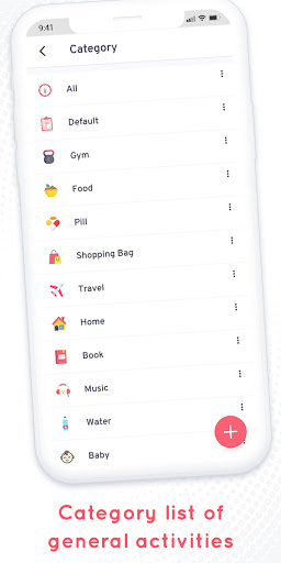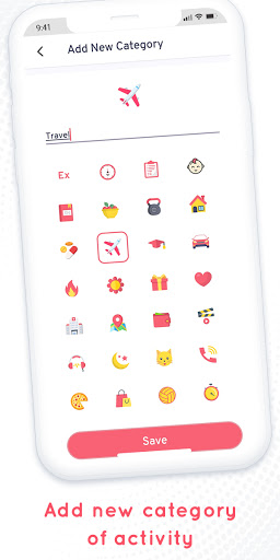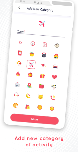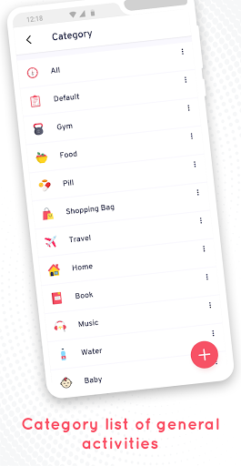 • Available categories: All, Default, Baby, Book, Food, Gym, Home, Pill, Travel, Cap, Car, Flame, Flowers, Gift, Heart, Hospital, Map, Money, Movie, Music, Night, Pet, Phone, Pizza, Shopping Bag, Sport, Stop Watch, Train, Water, Weather