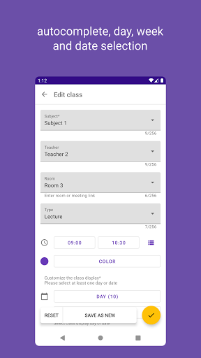 The application provides a convenient constructor for creating and editing timetable, autocomplete fields with already entered data, add classes for several days of the week, show or hide classes on the selected date