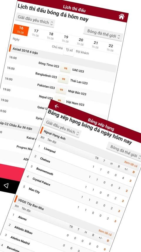 The Doc Bao Bong Da application includes football news, sports scores, live scores, live scores, rankings, predictions and post-match highlights. England, Spain, Italy, Germany, France and many others such as World Cup, Euro, Chamspion League, Asiad 2018, U23 Vietnam