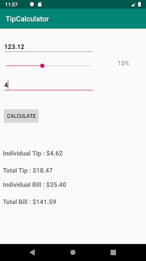 An easy to use tip calculator, that provides all the information you need for your expenses and tips. Allows users to split a bill and tips among multiple people or for yourself. In addition, calculates the bill and tips, and displays them individually and in total.