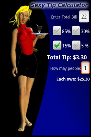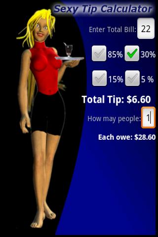 Let our sexy waitress calculate the tip.She gets hotter as tips go upLet our sexy waitress calculate your dining tip and accurately split up the bill.The more you tip, the better the waitressInput the total bill for your meal and select the percentage you would like to tip.You39;ll quickley be given the calculated tip.Perfect for breakfast, lunch, and dinner.Gives immediate feedback on the quality of the tip.Also holds your friends and coworkers responsable for paying their share of the bill.