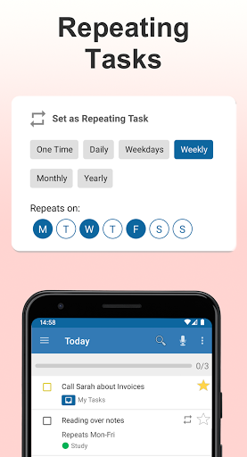 • Repeating tasks: create tasks to repeat Weekdays, Weekly, Monthly or Yearly with flexible custom options