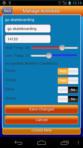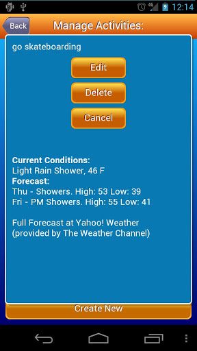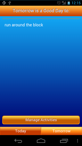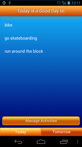 Today is a Good Day To is an app for active individuals who would like to quickly find out if today or tomorrow is a good day to do something based on the weather conditions of a specified location.Today is a Good Day To allows users to create custom activities that compare weather data of the specified locationto the criteria of activity.Users can customize activities based on: The Activity39;s Name The Activity39;s Location based on US zip code The temperature Range High temp maximum and Low temp minimum The Acceptable Generalize Weather Conditions: Sunny Cloudy Rainy SnowyIf the activity39;s weather conditions meet the conditions for the specified area for that day or the next, Today is A Good Day To will update each list accordingly.There39;s no limit to the number of activities you want to look out for each dayIf you39;d like to help us make this better and report some bugs feel free to email me Built by Jack McDonald and Kyler Mulherin.Today is a Good Day To... uses the MadComponents library developed by Daniel Freeman.Special thanks to Jasper Valero for providing the code to convert zip codes to WOEIDs