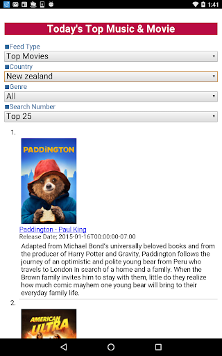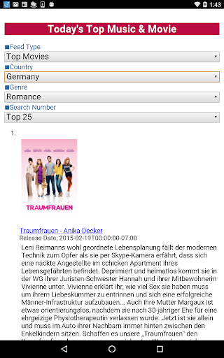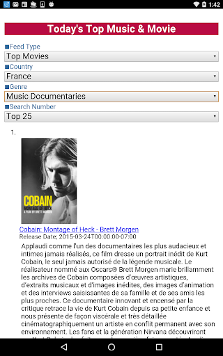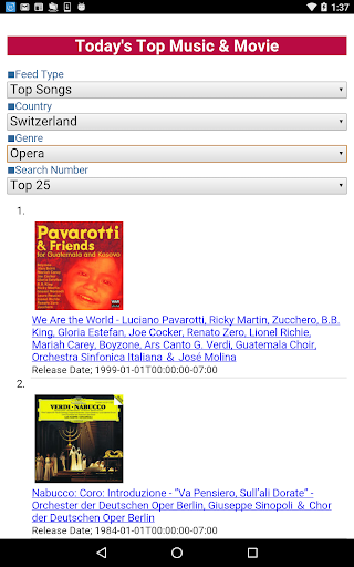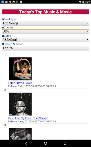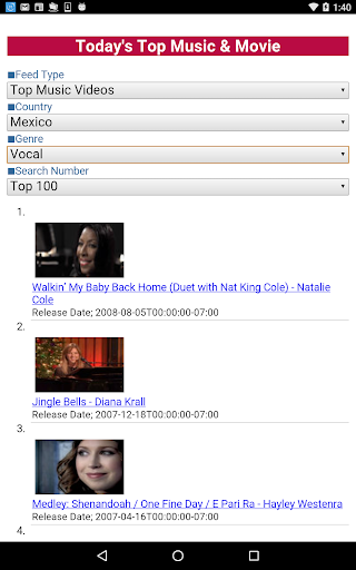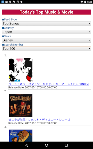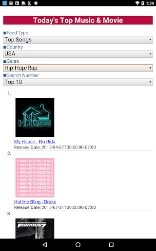 This application displays the chart of hit songs and movies according to the country(★1) and the genre(★2)(★3).