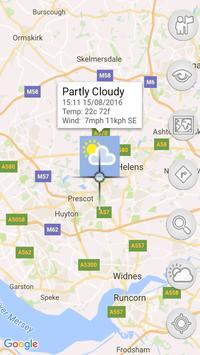 Hold - Menu shows a list of weather icons and data. Tap a menu item to position the map over that area