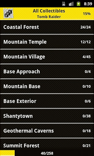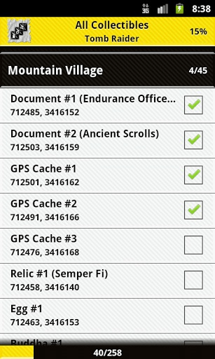 The checklist you need to take note of every collectible you obtain in "Tomb Raider" This checklist includes every: - Challenge. - Document. - GPS Cache. - Relic. - Tomb. - This checklist not only includes every collectible but also their coordinates. After installing the checklist run it to add it to the app. ** Note: To use this checklist you need to have installed "Golden Checklists". Download it now from Google Play, it's free!