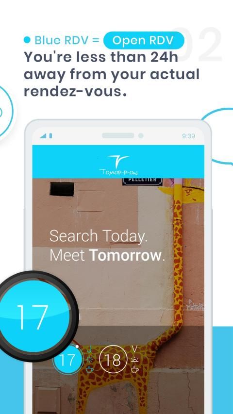 Choose a day / a place / a mood to meet someone in real life, and Tomorrow will show you 24 hours before the start of the date twenty profiles who made the same choices. No more wasted hours spent for nothing in a dating App, you don't use Tomorrow because you are bored at home, but to take advantage of the available time you have in the week for a real date… as soon as tomorrow ;-)