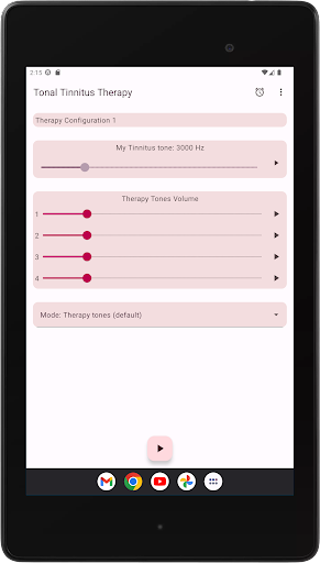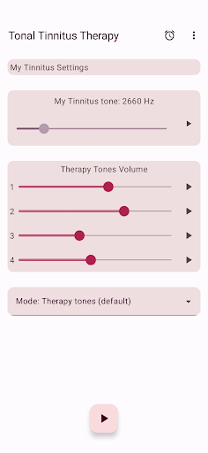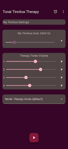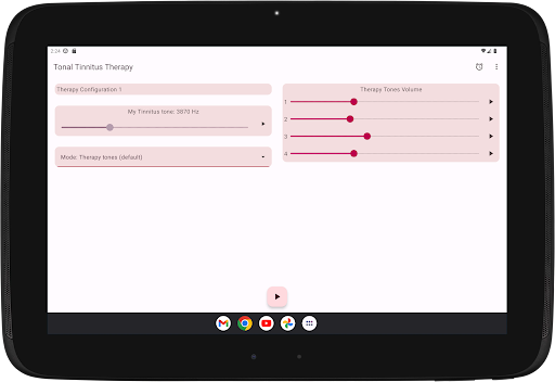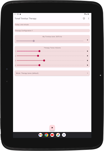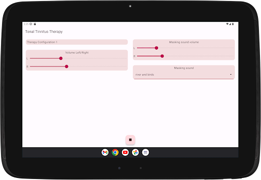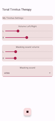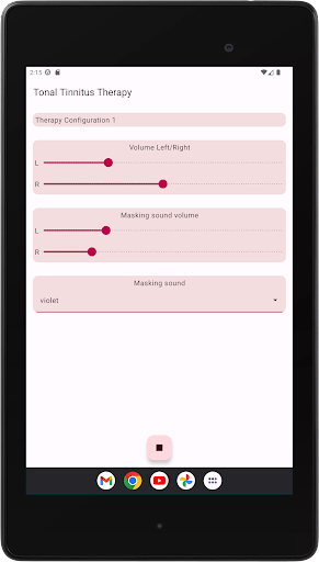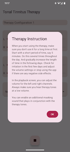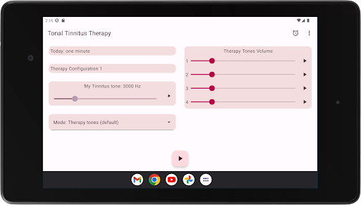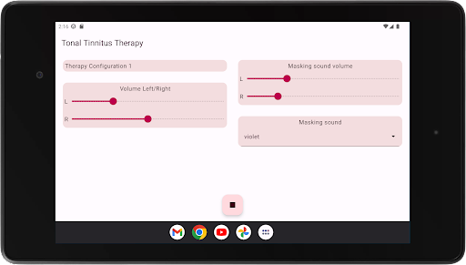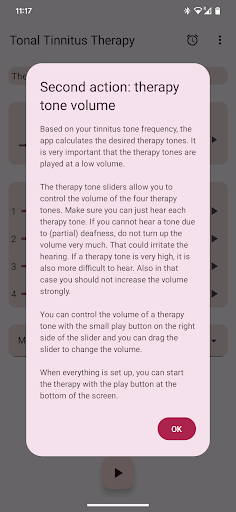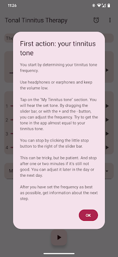 The app configures four therapy tones, two below and two above your Tinnitus tone. Acoustic neuromodulation uses these therapy tones in series of twelve with a short time interval to reset your Tinnitus tone. Before you start playing these series of therapy tones, you must check if you hear every therapy tone at the same volume. You can adapt the volume of every therapy tone if needed. Then you can start playing the therapy tones. While playing you can change the volume for left and right channel in the main screen. You can close the main screen and reopen it whenever you want. Playing the therapy tones happens in the background, you see the app icon in the notification bar while it is running.