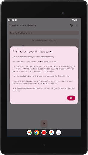 Usage is simple: first find the frequency of your most dominant Tinnitus tone. The app plays the selected frequency and you can change the frequency until it matches your tone. Don't do this too quickly, it is absolutely necessary to find the right frequency. You can always check again if you have the right frequency selected.