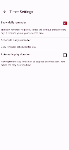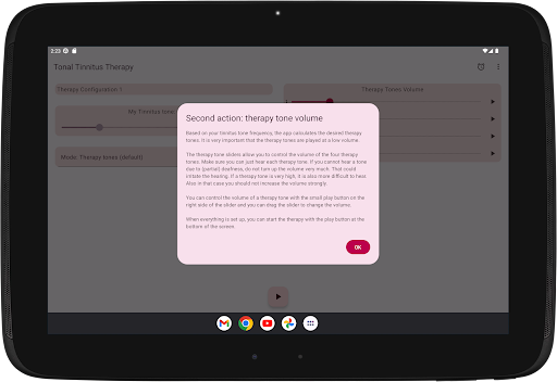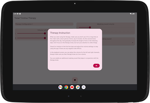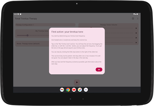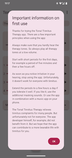 If you suffer from hyperacusis, then be careful when using the app. Start with a few short periods of usage on a very low volume. When the therapy tones cause negative effects, don't continue using the app.